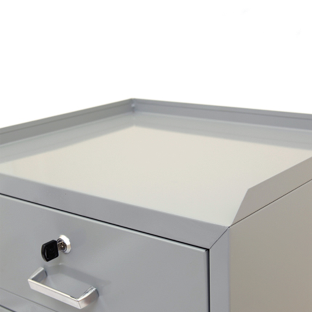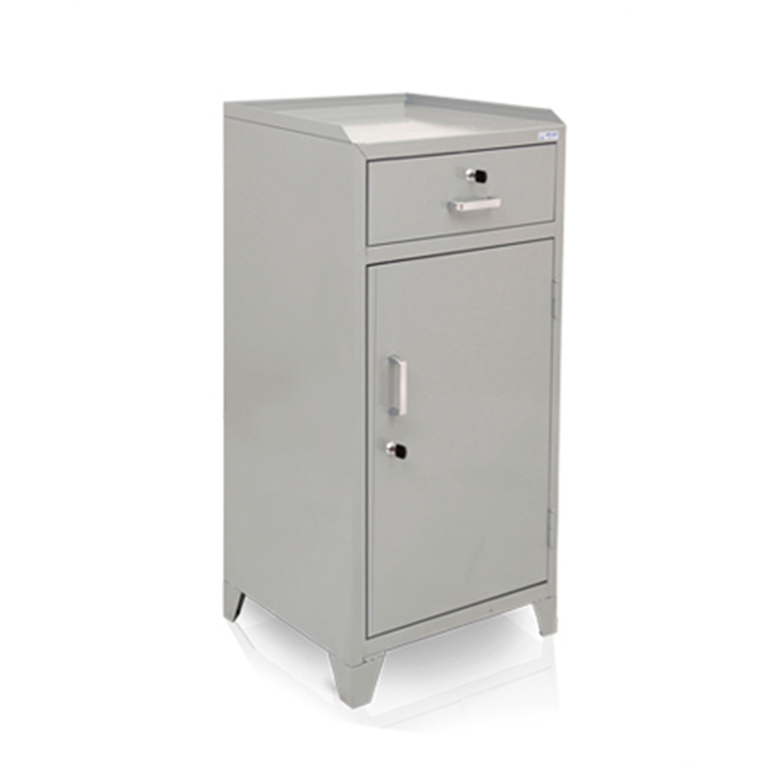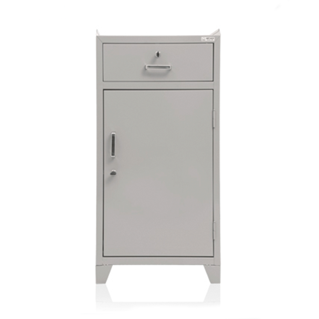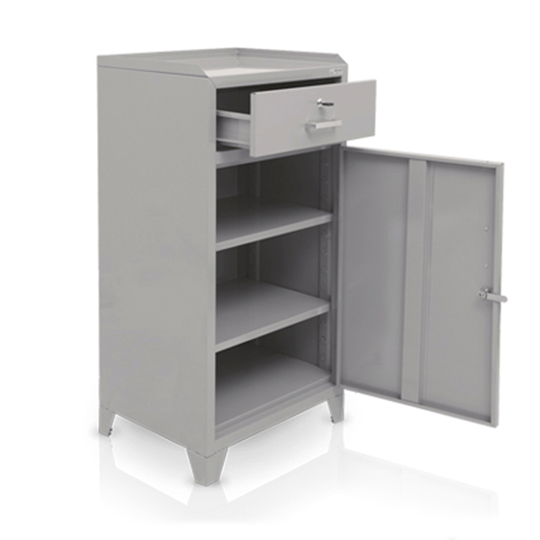 Fabricado em chapa de aço #26, o armário conta com 1 gaveta e 1 porta com abertura lateral, ambos com fechaduras cilíndricas individuais e chaves em duplicata. A estrutura inclui puxadores em polipropileno cromado, 2 dobradiças tipo pivô e 2 prateleiras internas reguláveis para melhor aproveitamento do espaço.