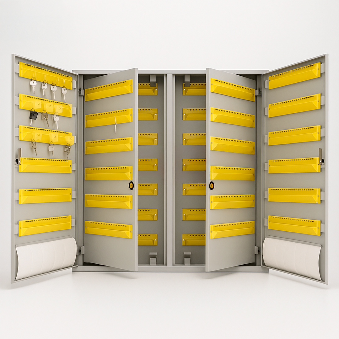 Internamente, as chaves são organizadas por suportes com chaveiros em poliestireno de alto impacto na cor amarela, garantindo identificação visual clara. A fechadura tipo Yale com chave duplicata assegura o travamento eficiente. A identificação sequencial numérica e o índice de controle acompanham o produto, proporcionando fácil rastreio e gerenciamento.