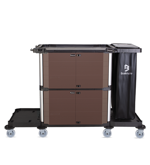 Sua estrutura alongada proporciona melhor distribuição dos equipamentos. Conta ainda com alça fixadora para cabos e acessórios, e bases com rodas carenadas ideais para transporte de baldes, aspiradores e materiais diversos. É ideal para hospitais, indústrias, grandes centros comerciais e empresas de limpeza profissional.