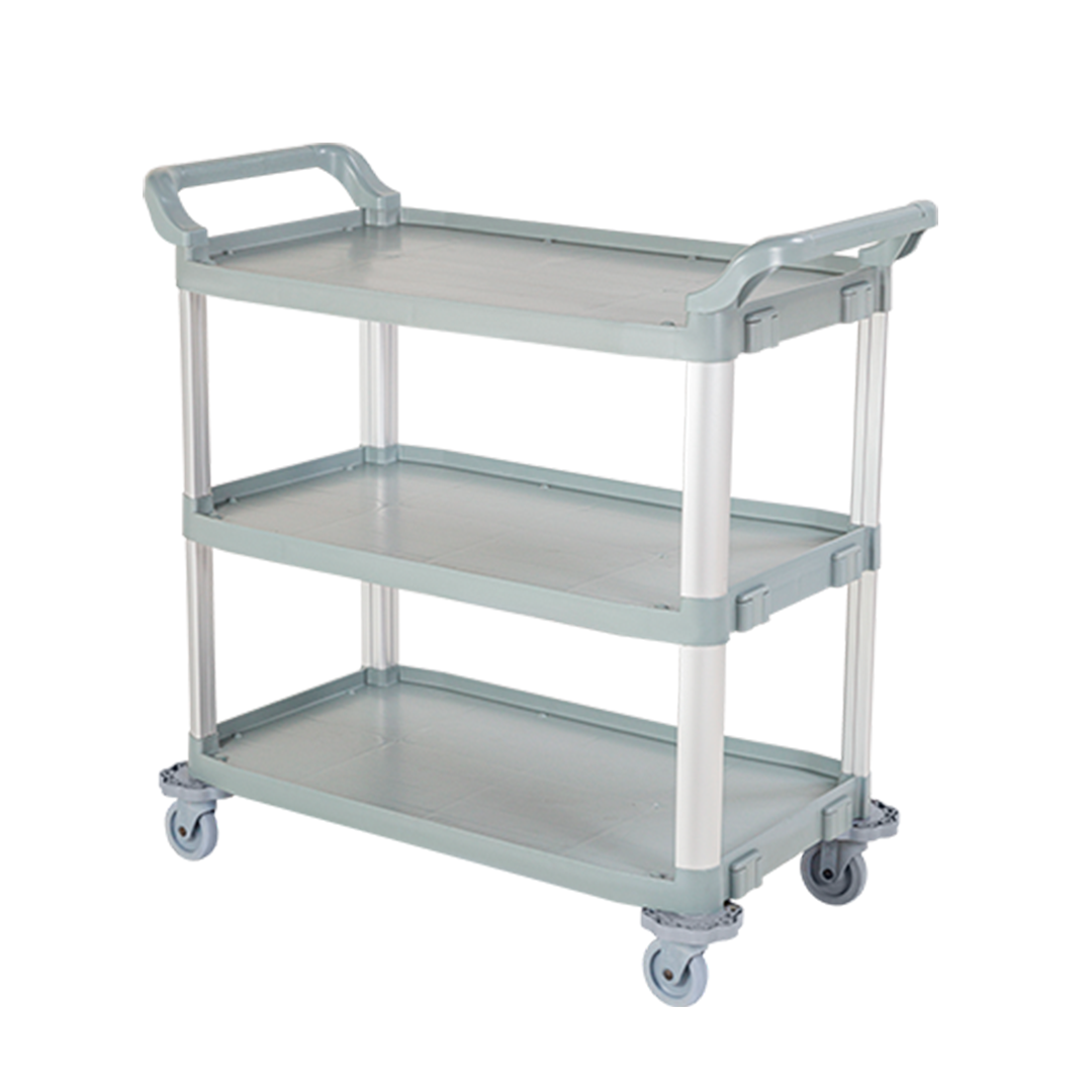 Carro bandeja com 3 níveis em alumínio e polipropileno, resistente, com rodas giratórias e ideal para transporte em ambientes profissionais.