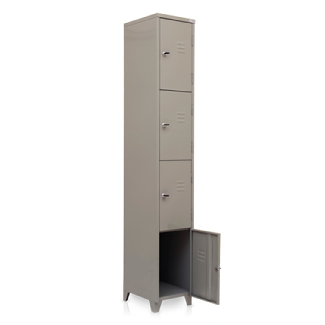 Cada porta possui reforço vertical interno, travas com fechadura e 3 aberturas tipo veneziana, garantindo ventilação eficiente. A estrutura elevada por 4 pés em chapa metálica facilita a limpeza do ambiente e contribui para maior durabilidade.