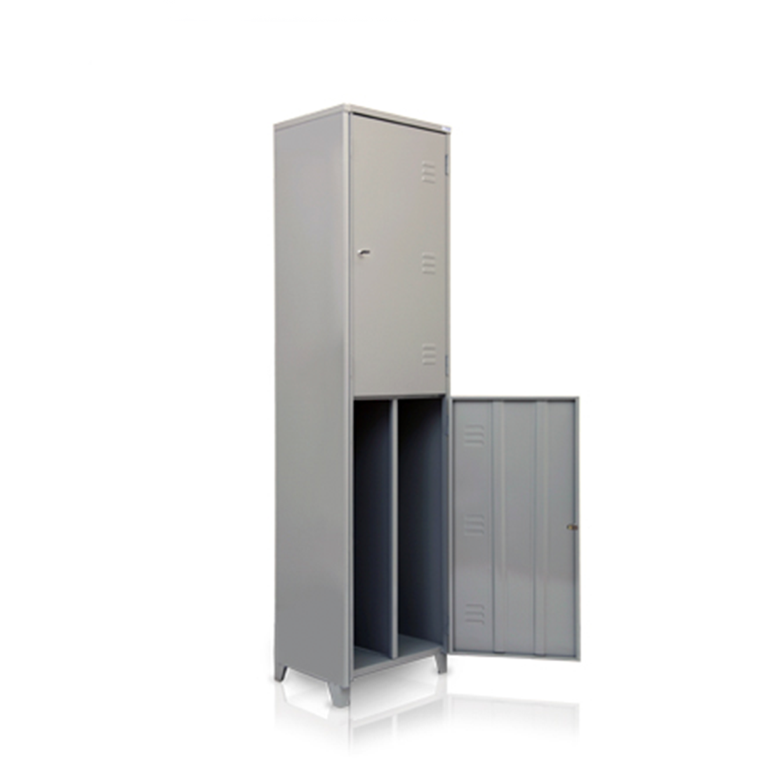 As portas contam com reforços verticais internos, 9 aberturas tipo veneziana para ventilação e fechadura tipo yale para segurança. Os pés em chapa dobrada elevam o armário do piso, protegendo contra umidade e facilitando a limpeza.